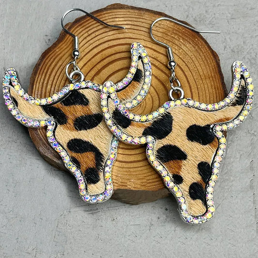 LARGE TEXAS LONGHORN EARRINGS Cowhide White Black Center Leather Western Jewelry Stud Taurus Earrings Bull Skull Valentines Gift